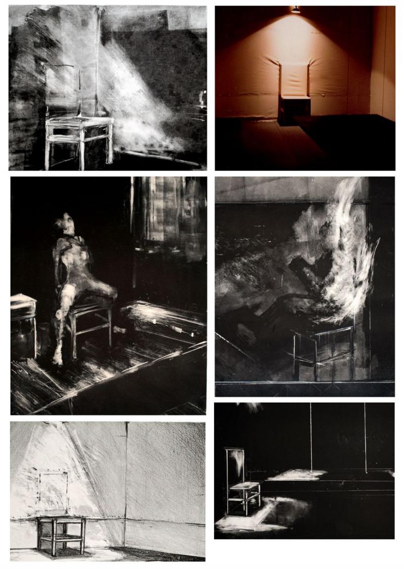 This exhibition included work in a wide variety of formats including monotypes, photos from installations, lithographs, etchings, drawings, reproductions of paintings, schematic designs and a re-creation of the original "the chair" built in 1982.